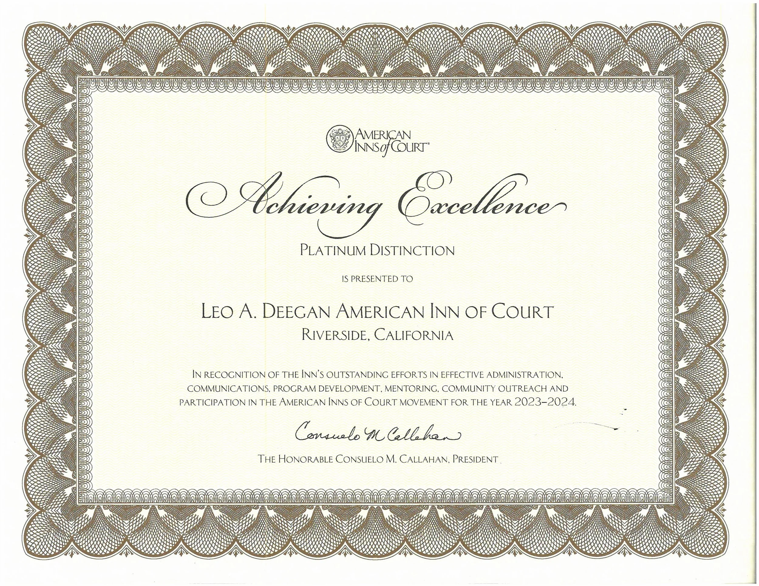 For the 2023-2024 program year, the Leo A. Deegan Inn of Court was awarded Platinum Distinction for Achieving Excellence. This is the sixth program year in which the Leo A. Deegan Inn of Court received Platinum Distinction.