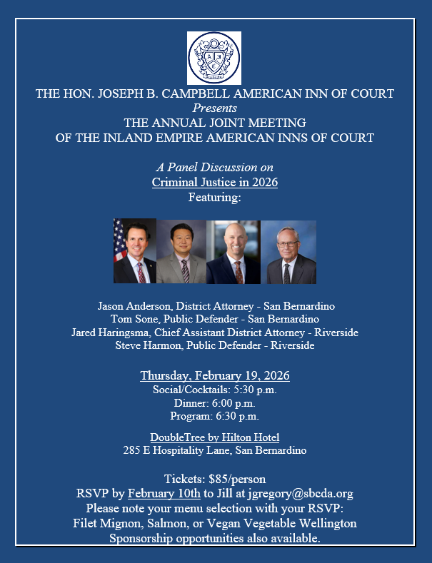 The Hon. Joseph Campbell Inn of Court has extended an invitation to all Deegan Inn members to attend their annual “State of the Courts” meeting on Wednesday, June 11, 2025, featuring Hon. Manuel Ramirez, Presiding Justice of the Court of Appeal, Fourth District, Division Two, Hon. Lisa M. Rogan, Presiding Judge of the San Bernardino County Superior Court, and Hon. Dean Benjamini, Assistant Presiding Judge of the Riverside Superior Court. The meeting will be held at the Redlands American Legion Post 105 and the cost is $60. Please RSVP to JGregory@sbcda.org by June 3, 2025.